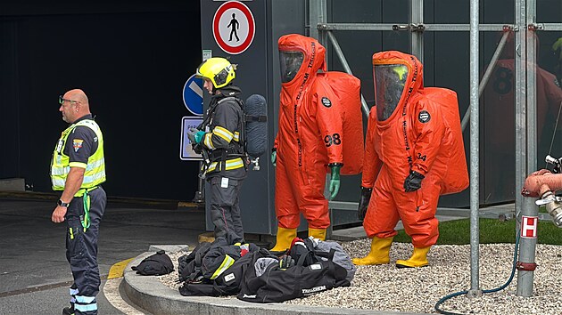 Pražští hasiči zasahovali v kancelářské budově v Nuslích v ulici 5. května, z důvodu přítomnosti nebezpečné chemické látky. (28. července 2025)
