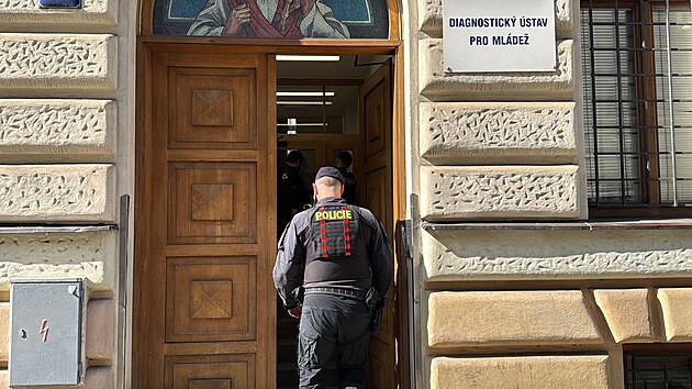 Jednotky policie na místě pádu chlapce z okna. (21. března 2025)