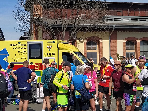 Na pražském půlmaratonu potřebovaly ošetření záchranářů vyšší desítky běžců. Někteří zkolabovali v prostoru cíle při čekání na rytinu do medaile. (6. dubna 2024)