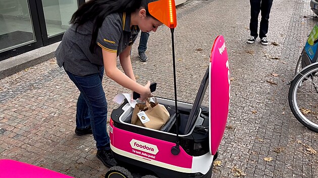 „Když taková objednávka přijde, vezme se připravené jídlo a telefon s otevřenou aplikací, co tady k tomu máme, přijde se k robotovi, ten se po zadání kódu do aplikace otevře, dá se to dovnitř, robot se zavře a odjíždí,“ popisuje obsluhující žena.