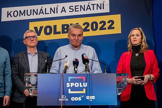Tisková konference po jednání pražského SPOLU s Piráty a STAN o vzniku nové pražské koalice. Zleva: Zdeněk Zajíček (ODS), Bohuslav Svoboda (ODS) a Jana Komrsková (Piráti). (23. ledna 2023)