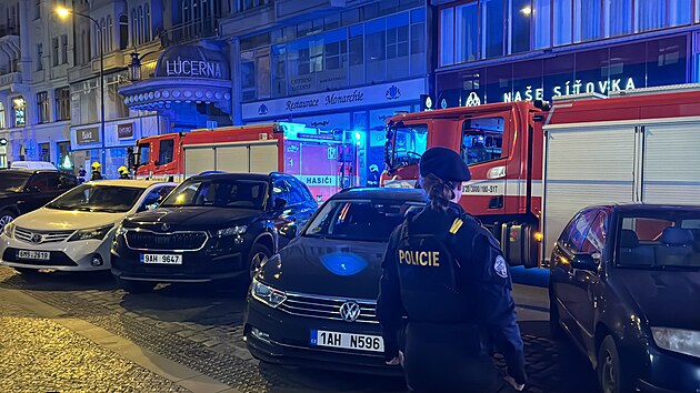 Zásah kvůli hlášené bombě před budovou Lucerny. (20. března 2025)