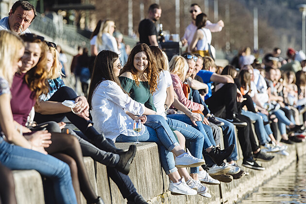 Teplé počasí si užili lidé také v Praze, odpoledne se sešli u Vltavy na Náplavce.(30. března 2021)