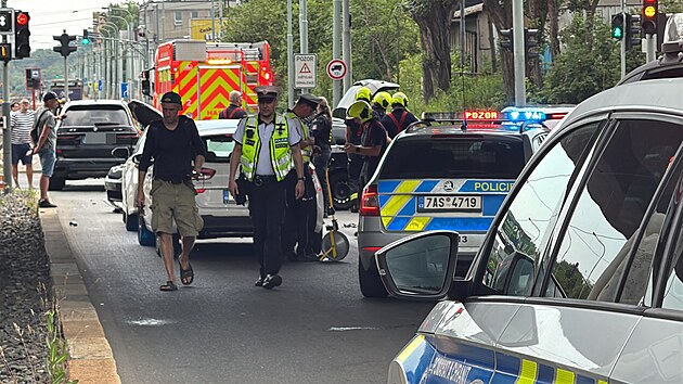 Havarovaná vozidla blokovala dopravu na Bucharově ulici. (15. června 2025)