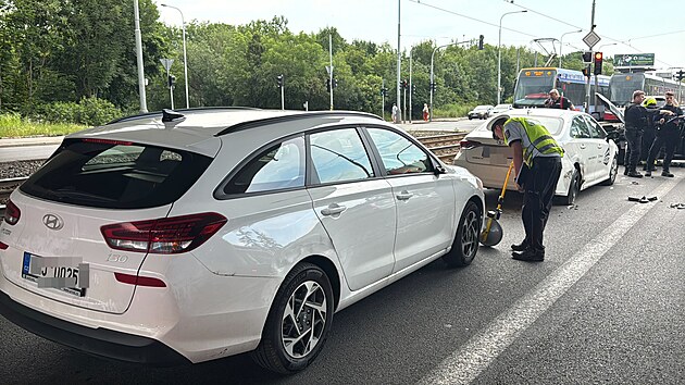 Havarovaná vozidla blokovala dopravu na Bucharově ulici. (15. června 2025)