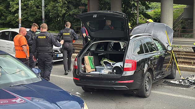 Havarovaná vozidla blokovala dopravu na Bucharově ulici. (15. června 2025)
