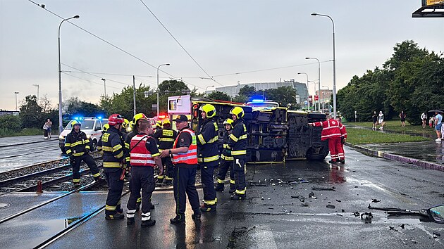 V Hostivaři se po srážce s jiným autem převrátila sanitka. (15. června 2025)
