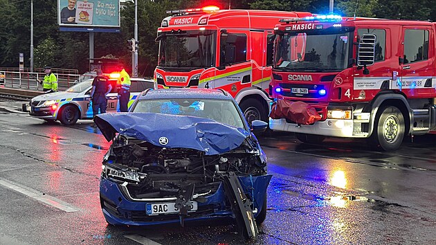 V Hostivaři se po srážce s jiným autem převrátila sanitka. (15. června 2025)