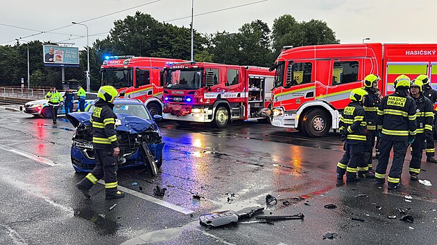 V Hostivaři se po srážce s jiným autem převrátila sanitka. (15. června 2025)