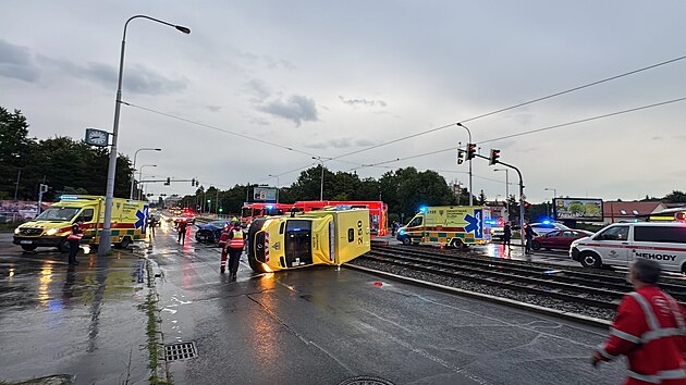 V Hostivaři se po srážce s jiným autem převrátila sanitka. (15. června 2025)