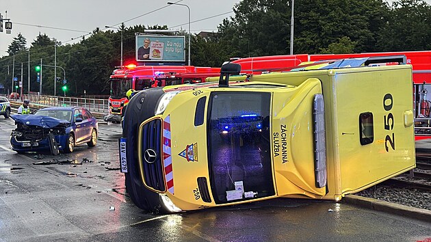 V Hostivaři se po srážce s jiným autem převrátila sanitka. (15. června 2025)
