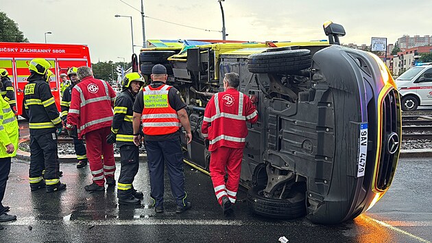 V Hostivaři se po srážce s jiným autem převrátila sanitka. (15. června 2025)