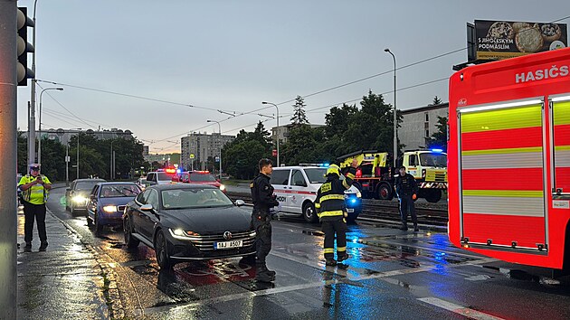 V Hostivaři se po srážce s jiným autem převrátila sanitka. (15. června 2025)