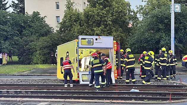 V Hostivaři se po srážce s jiným autem převrátila sanitka. (15. června 2025)