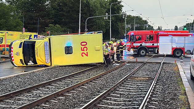 V Hostivaři se po srážce s jiným autem převrátila sanitka. (15. června 2025)