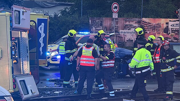 V Hostivaři se po srážce s jiným autem převrátila sanitka. (15. června 2025)