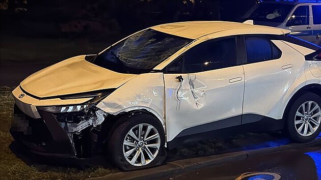V ulici Novodvorská najel řidič na obrubník, auto skončilo na střeše. (10. prosince 2025)