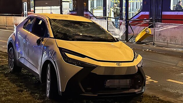V ulici Novodvorská najel řidič na obrubník, auto skončilo na střeše. (10. prosince 2025)
