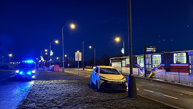 V ulici Novodvorská najel řidič na obrubník, auto skončilo na střeše. (10. prosince 2025)