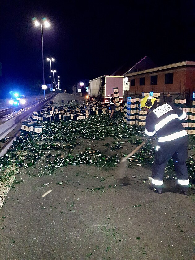 Nehoda kamionu, který vezl přepravky s pivem v pražských Lahovicích. (15. srpna 2025)