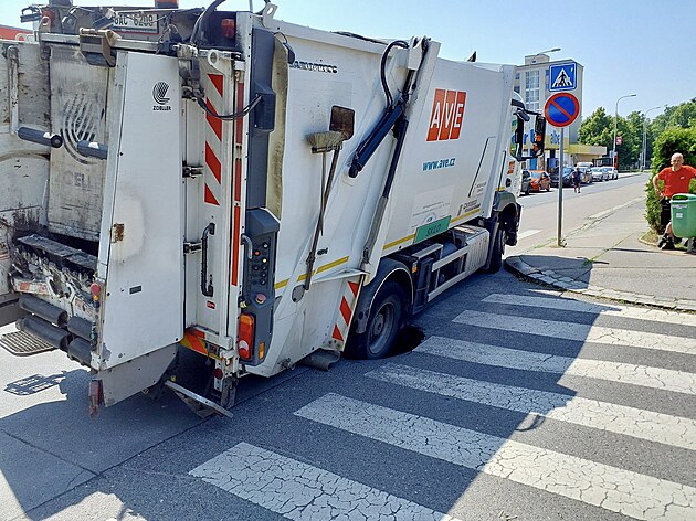 Popelářský vůz, který se propadl do vozovky v ulici K Ladví, vyprošťují hasiči pomocí automobilového jeřábu (12. června 2025)