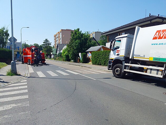 Popelářský vůz, který se propadl do vozovky v ulici K Ladví, vyprošťují hasiči pomocí automobilového jeřábu (12. června 2025)
