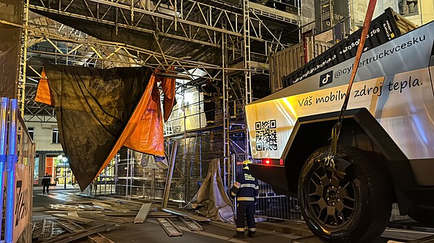Řidič vozidla odtahové služby strhl v centru Prahy na Prašné bráně lešení. (2. listopadu 2024)