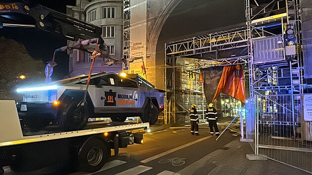 Řidič vozidla odtahové služby strhl v centru Prahy na Prašné bráně lešení. (2. listopadu 2024)