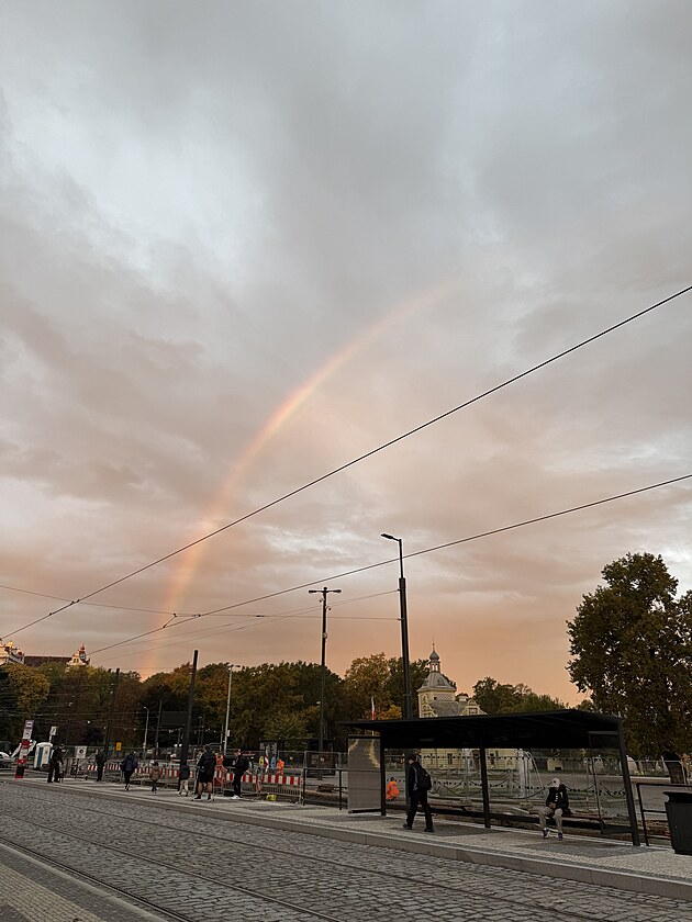 Ranní duha nad Prahou, pohled od Výstaviště v Holešovicích. (23. října 2025)