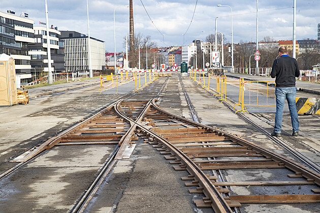 Kvůli rekonstrukci Libeňského mostu se na mostním tělese instaluje tramvajová úvrať. (15. února 2024)