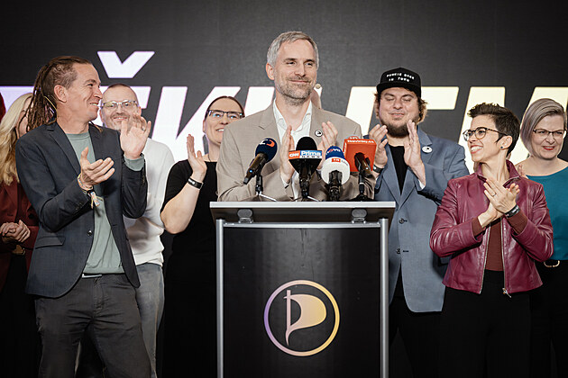 Tisková konference Pirátské strany po volbách do Sněmovny. Ivan Bartoš, Zdeněk Hřib. (4. října 2025)