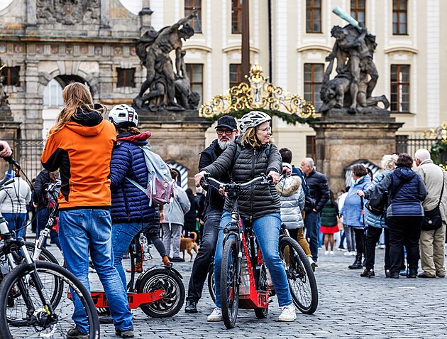 Nezvykle teplého počasí využili turisté v Praze i k vyjížďkám na kole po Hradčanském náměstí. (31. prosince 2022)