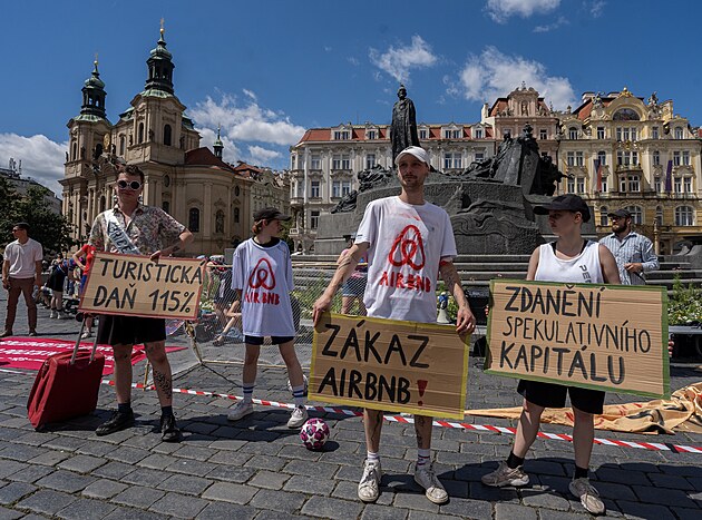 Několik desítek lidí na Staroměstském náměstí v Praze protestovalo proti masovému turismu. (28. června 2025)