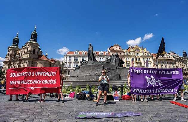 Několik desítek lidí na Staroměstském náměstí v Praze protestovalo proti masovému turismu. (28. června 2025)