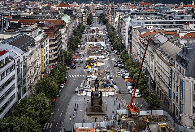 Horní část Václavského náměstí je už rok kompletně rozkopaná. (23. června 2025)