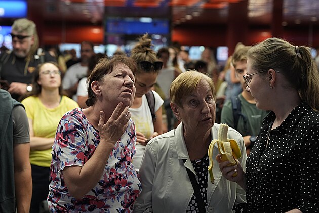 Lidé čekají před odjezdem na svátky v hale pražského hlavního nádraží, poté co se dozvěděli, že se kvůli výpadku proudu zastavily vlaky.