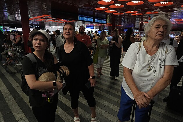 Lidé čekají před odjezdem na svátky v hale pražského hlavního nádraží, poté co se dozvěděli, že se kvůli výpadku proudu zastavily vlaky.