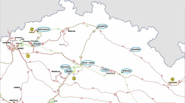 Mapa postižené části přenosové soustavy. 1 - pád vodiče na vedení V411. 2 - výpadek elektrárny Ledvice. 3 - výpadek vedení V 208. 4 - výpadek rozvodny Týnec-Krasíkov