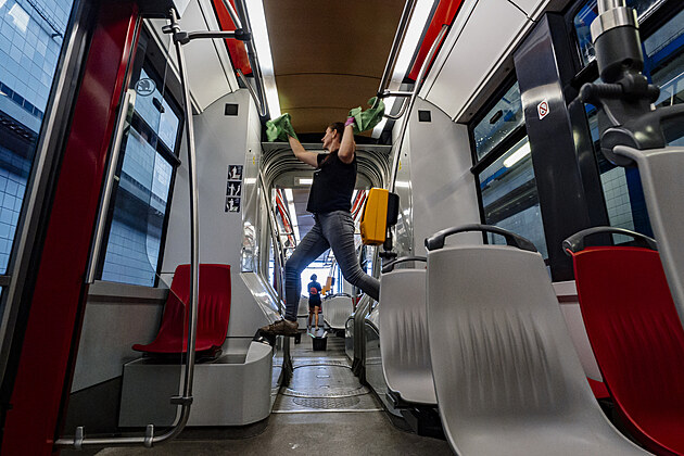 Tramvaje zajíždějí do myčky několikrát týdně. DPP čistí vnitřní prostory vozů každý večer a jednou měsíčně tramvaje procházejí rozsáhlým čištěním. (7. července 2025)