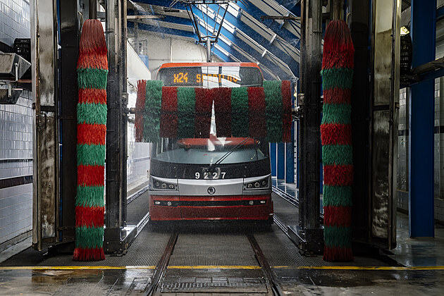 Tramvaje zajíždějí do myčky několikrát týdně. DPP čistí vnitřní prostory vozů každý večer a jednou měsíčně tramvaje procházejí rozsáhlým čištěním. (7. července 2025)