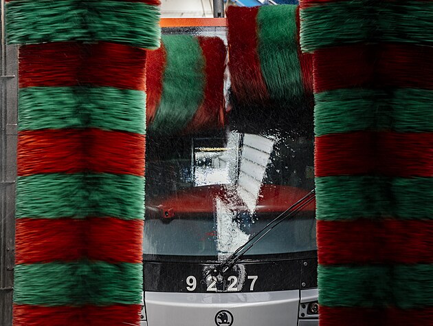 Tramvaje zajíždějí do myčky několikrát týdně. DPP čistí vnitřní prostory vozů každý večer a jednou měsíčně tramvaje procházejí rozsáhlým čištěním. (7. července 2025)