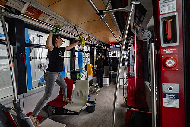 Tramvaje zajíždějí do myčky několikrát týdně. DPP čistí vnitřní prostory vozů každý večer a jednou měsíčně tramvaje procházejí rozsáhlým čištěním. (7. července 2025)
