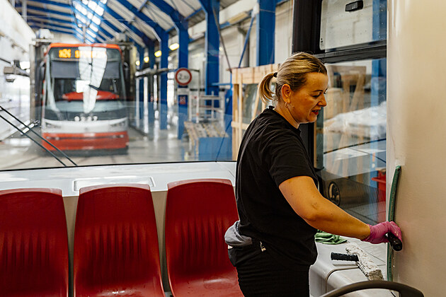 Tramvaje zajíždějí do myčky několikrát týdně. DPP čistí vnitřní prostory vozů každý večer a jednou měsíčně tramvaje procházejí rozsáhlým čištěním. (7. července 2025)
