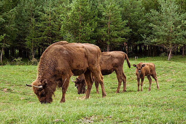 Zubři v Přírodní rezervaci Milovice. V roce 2023 se narodilo již 8 zubřích mláďat.