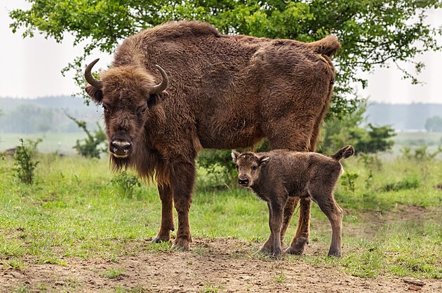 Zubři v Přírodní rezervaci Milovice. V roce 2023 se narodilo již 8 zubřích mláďat.
