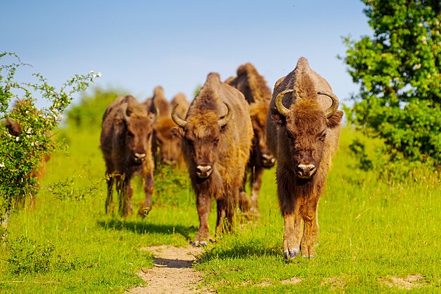 Zubři v Přírodní rezervaci Milovice. V roce 2023 se narodilo již 8 zubřích mláďat.