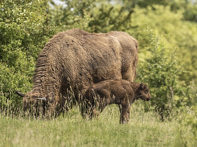 Zubři v Přírodní rezervaci Milovice. V roce 2023 se narodilo již 8 zubřích mláďat.