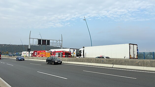 Na Pražském okruhu ve směru na Ruzyni a D5 se ve čtvrtek před polednem srazily tři kamiony. (24. října 2024)