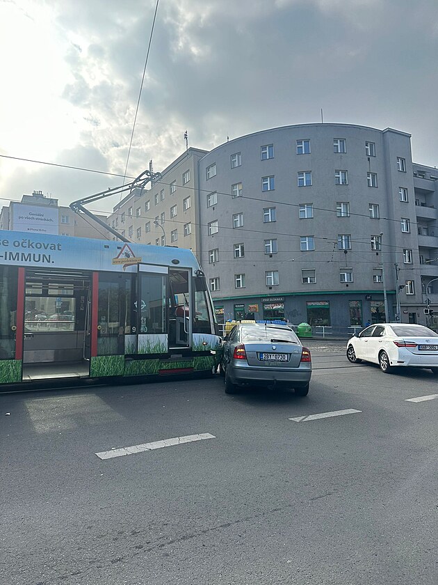 Srážka osobního automobilu a tramvaje v ulici Olšanská