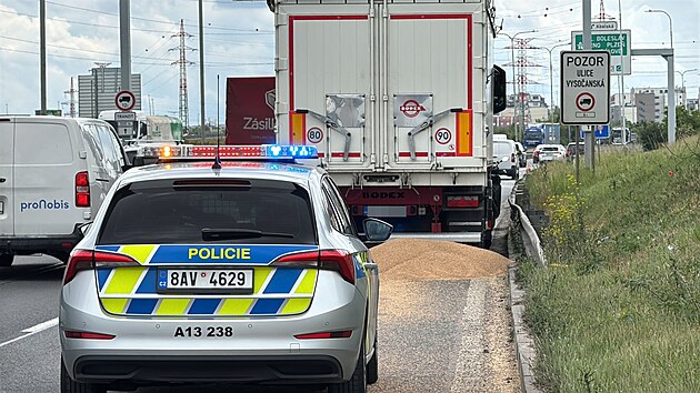 Vysypané obilí z kamionu blokuje jeden odbočovací pruh na Pražském okruhu. (2. června 2025)